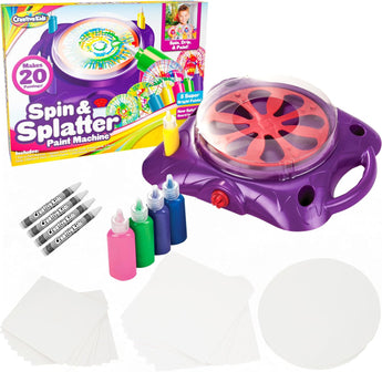 - Tout-en-Un : Comprend une Spin Art Machine, un splatter guard, 5 bouteilles de peinture, 4 crayons blancs, et 20 cartes de tailles et formes variées pour créer des œuvres uniques.