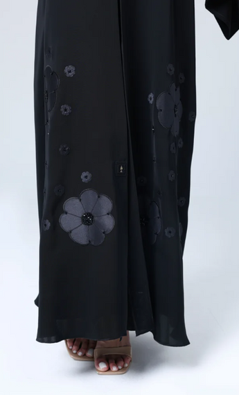 Cette abaya unie se distingue par ses appliqués floraux délicats, apportant une touche raffinée et sophistiquée à votre tenue.