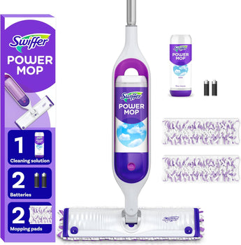 Le kit comprend : un balai pulvérisateur PowerMop, 2 recharges de tampons de nettoyage, 1 solution de nettoyage des sols au parfum frais et 2 piles