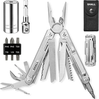 🎁【Outil multifonction 18 en 1】- Les pinces multi-outils SHALL comprennent une pince à bec long, une pince à sertir ordinaire, un coupe-fil, une règle, un clip de poche, des ciseaux, des tournevis plats, un ouvre-bouteille/boîte, une pince à dénuder, une lime, une scie, des couteaux multi-outils, des embouts de tournevis cruciformes (PH0/PH1/PH2) et torx (T15/T20/T25) et plats (1/8 et 3/16), une douille universelle, un adaptateur de douille.