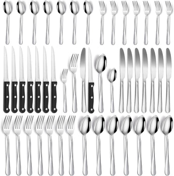 - 🌟 Service complet pour 12 personnes : 12 cuillères à soupe, 12 cuillères à café, 12 fourchettes à dîner, 12 fourchettes à salade, 12 couteaux à dîner et 12 couteaux à steak inclus – plus besoin d’acheter les couteaux à steak séparément.